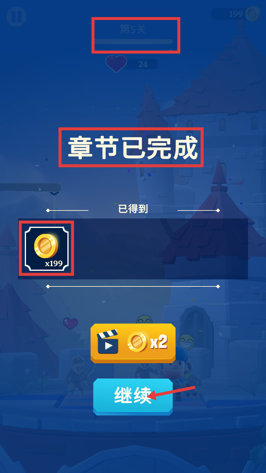 4、第5关章节完成,领取【x199】金币,点击【继续】,推进新关卡解锁流程。