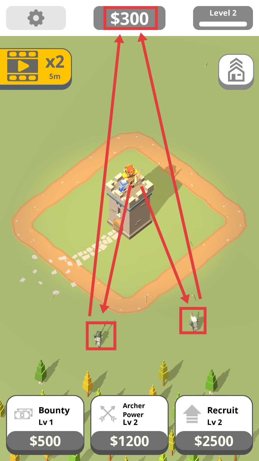 1、初始有【$750】,选择底部【Bounty】【ArcherPower】【Recruit】任一升级,启动防御体系搭建。