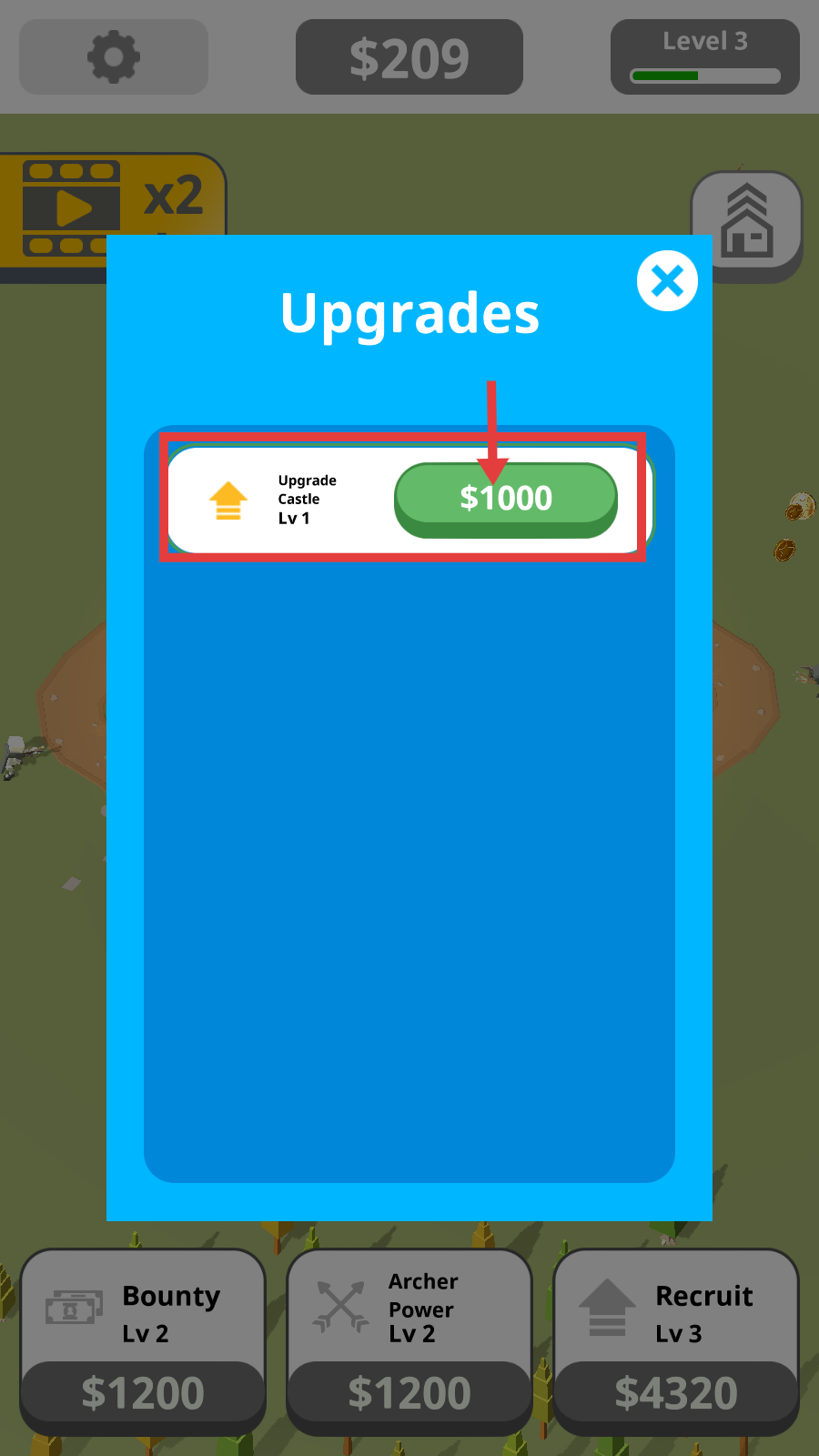 3、积累至【$1000】,点击【UpgradeCastleLv1】升级城堡,提升核心防御属性。