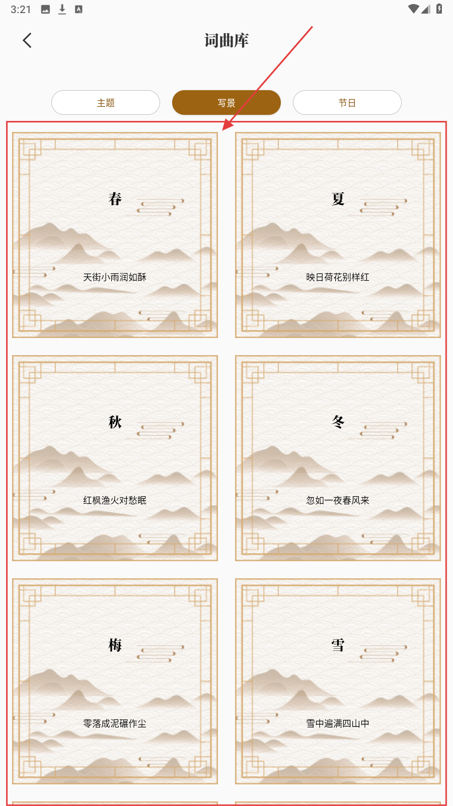 2、在【写景】词曲库,选【春】主题,浏览对应诗词卡片。