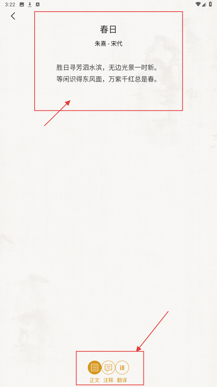 4、阅读完,点【注释】【翻译】,深入理解诗词含义。