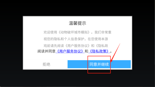 1、同意协议:在“温馨提示”界面点击“同意并继续”,正式开启游戏。