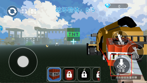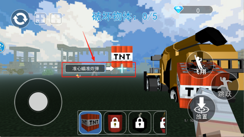 4、放置炸弹:瞄准物体后点击“放”按钮,成功放置第一颗TNT,任务进度变为1/5。