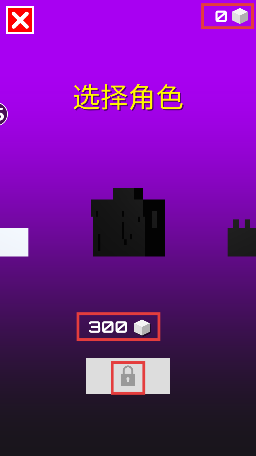 2、角色选择界面,积累【300】方块可解锁新角色,锁形图标需达成条件才能开启。
