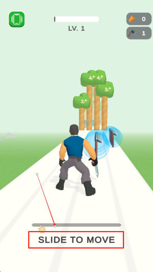 2、滑动控制位置:左右滑动屏幕调整伐木工位置,精准对准目标树木,为高效伐木与拾取斧头做好准备。