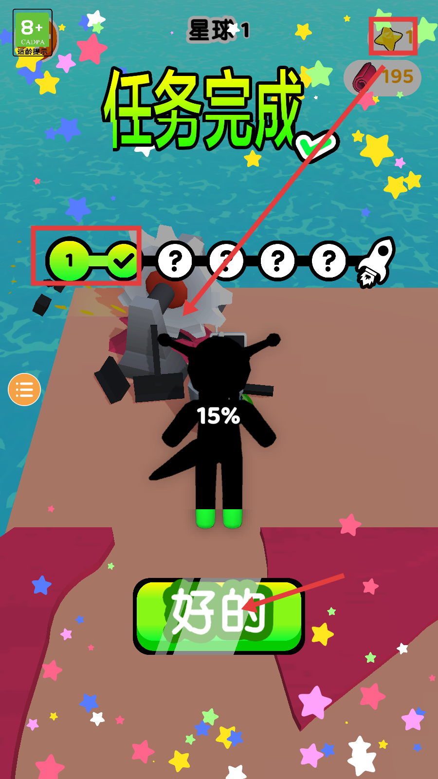 4、达成星球1第1阶段任务(圆环打勾),点击【好的】,领取奖励并解锁后续关卡。