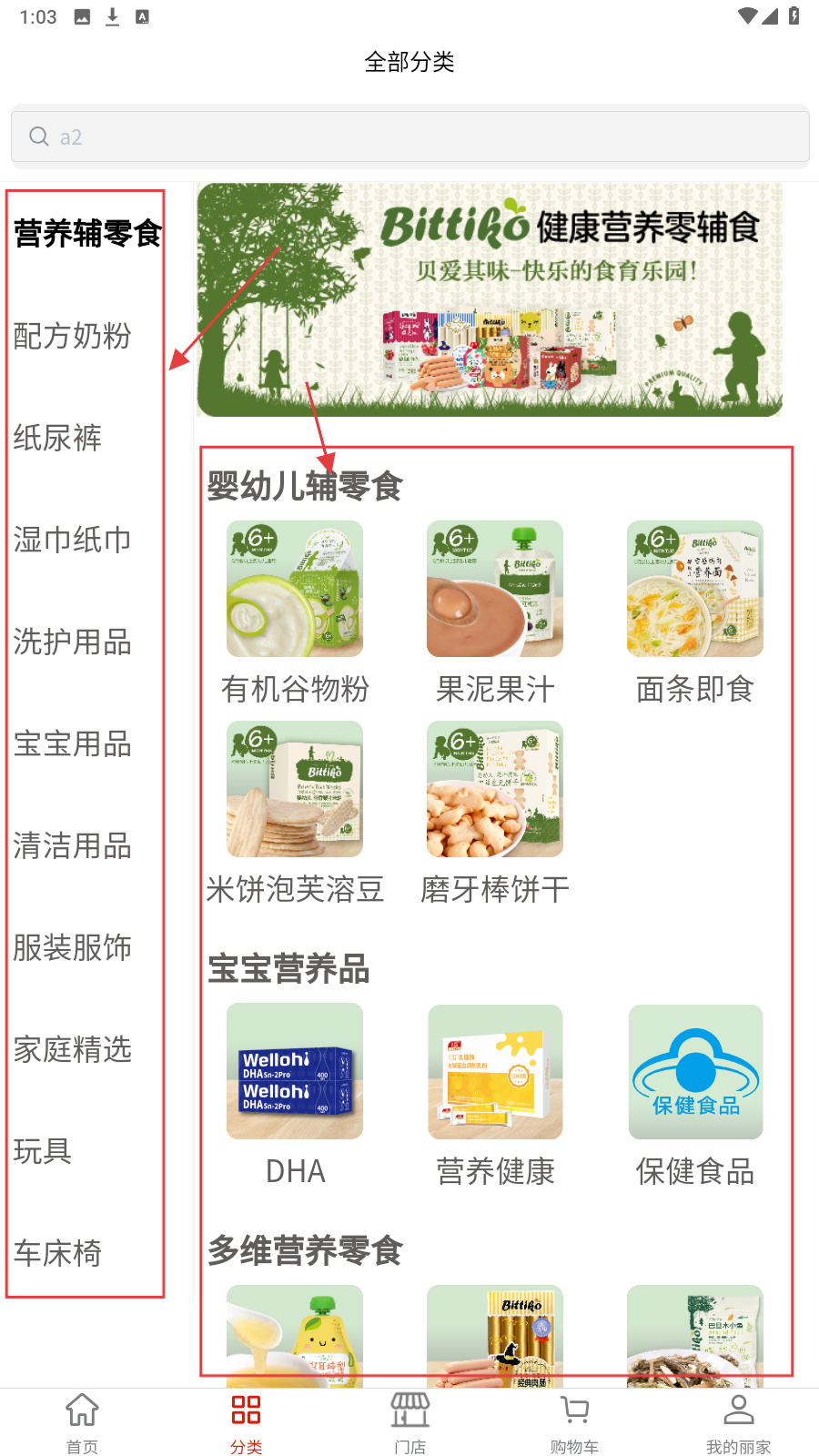 1、进入【分类】页,选【营养辅零食】,精准定位母婴辅食类商品。