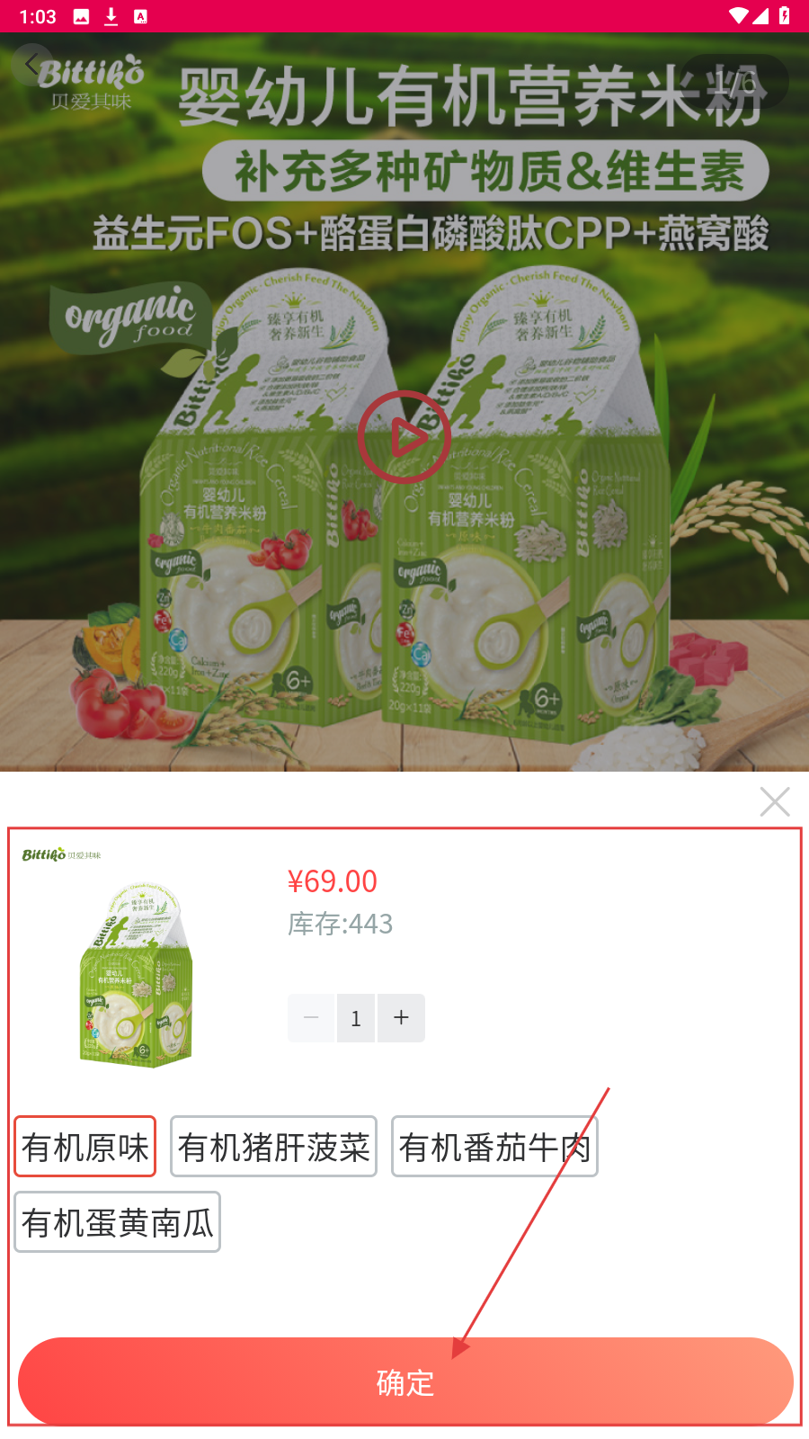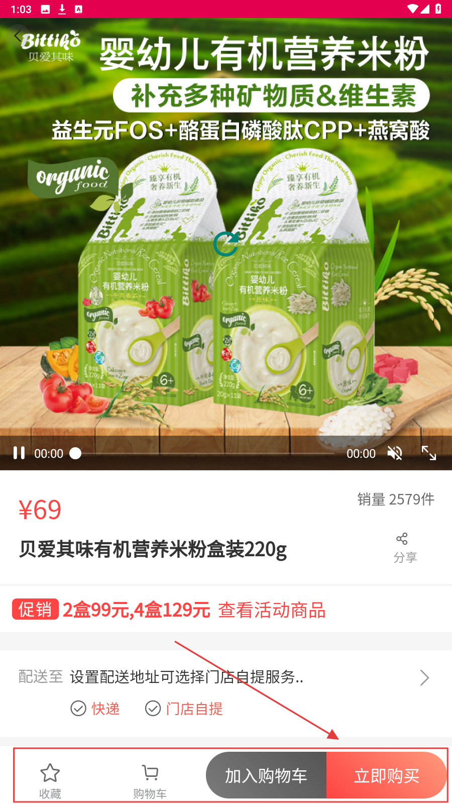 3、进入商品页,了解贝爱其味有机米粉促销,点【立即购买】下单。
