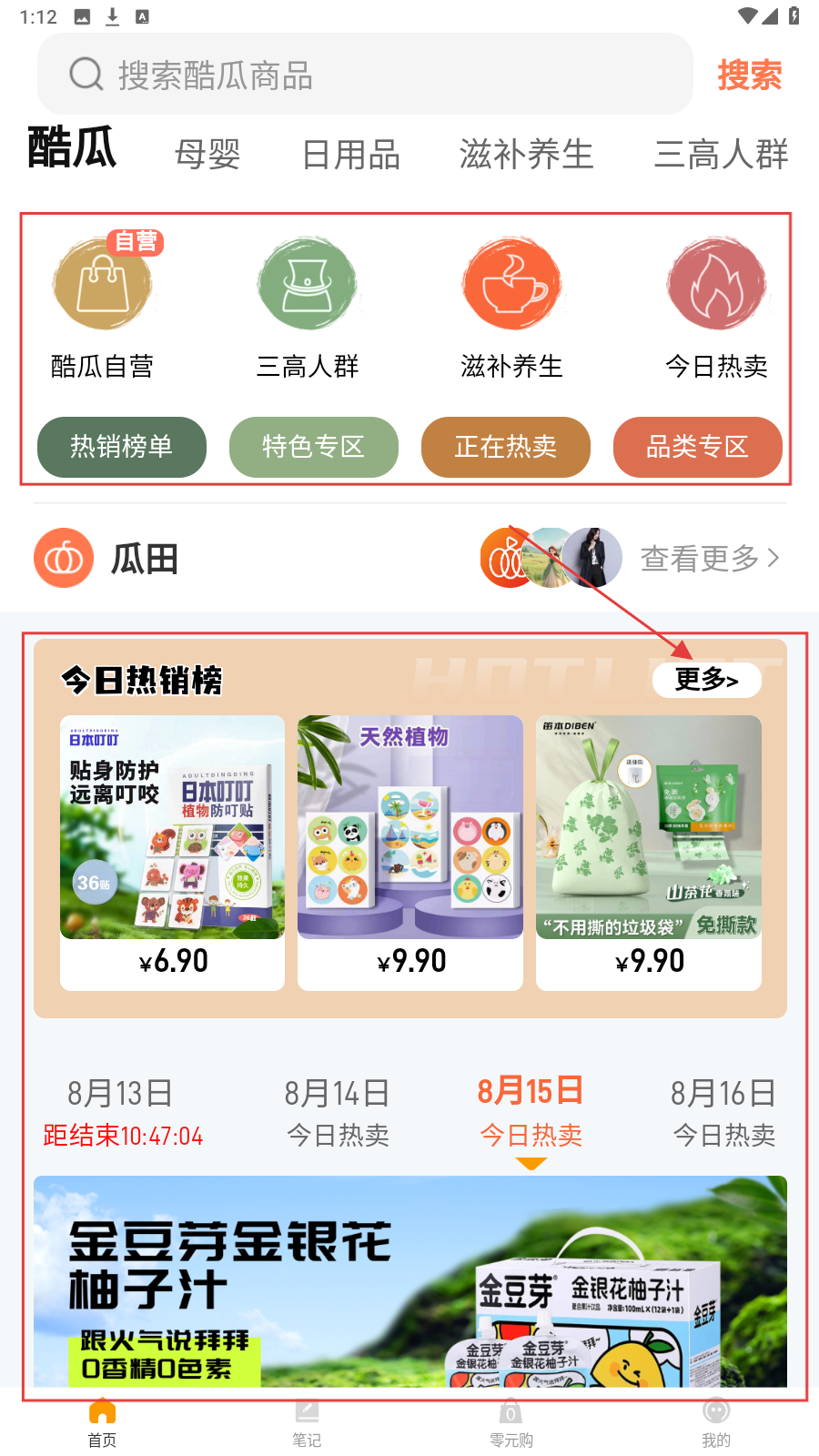 1、进入应用首页,按需选【母婴】【日用品】等分类,快速找目标商品。