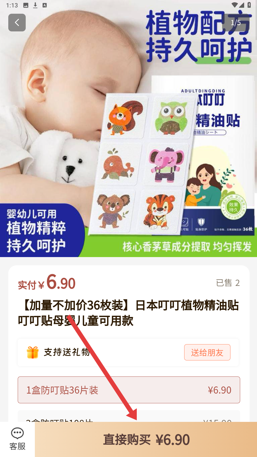 3、选日本叮叮精油贴,查看详情后点【直接购买-6.90】进入下单。