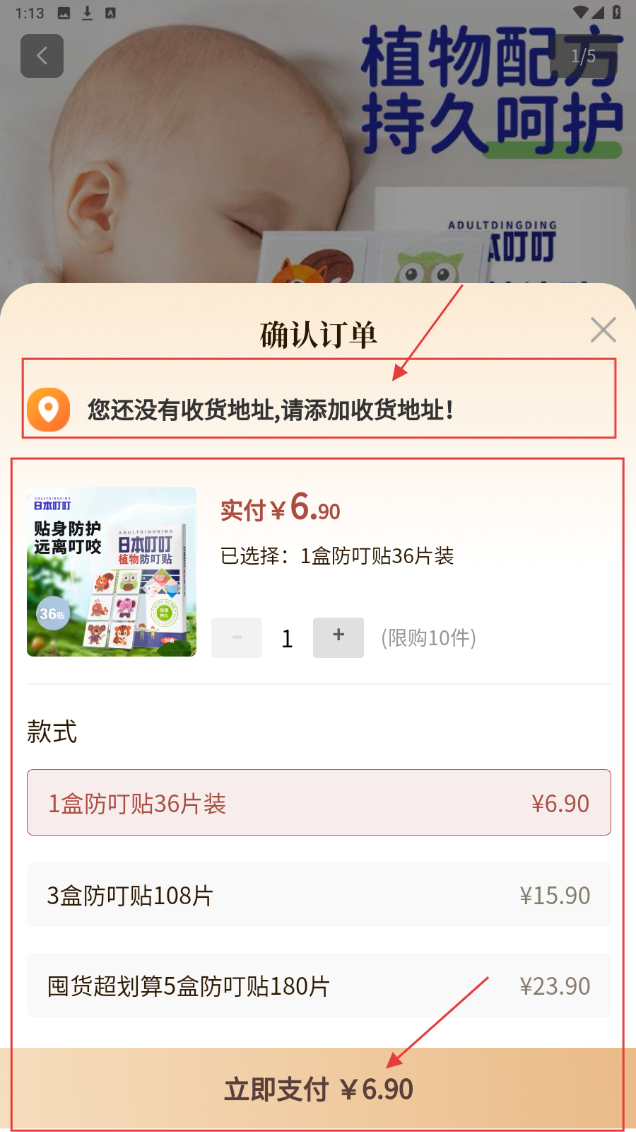 4、确认订单时,添加收货地址,选款式数量后点【立即支付-6.90】完成。