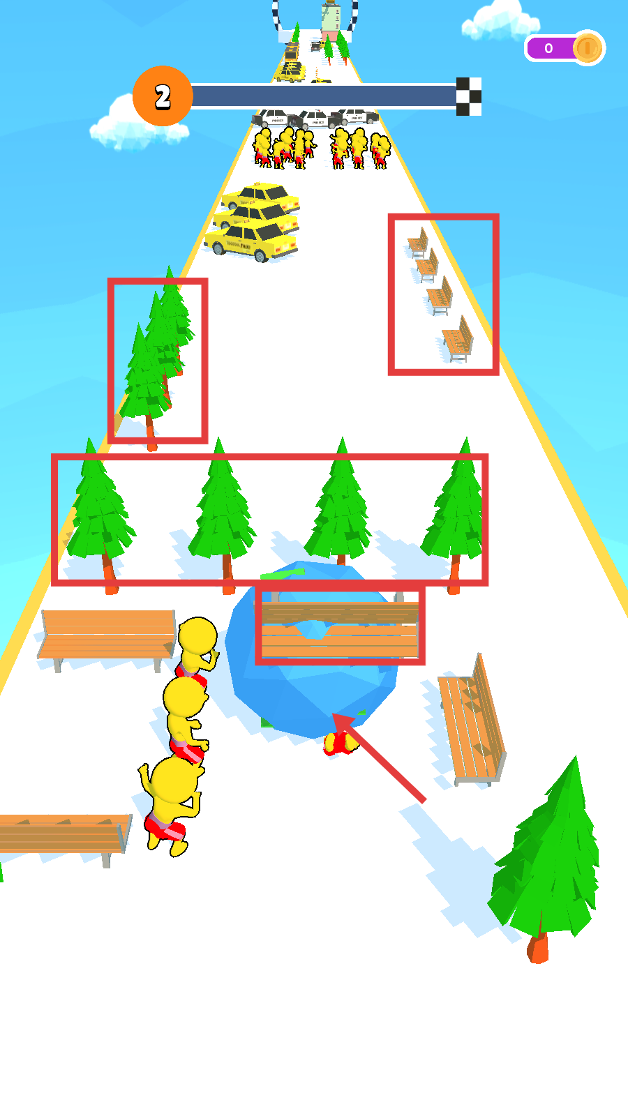 2、球体滚动中,利用【黄色角色-木质长椅-绿色树木】扩充体积,碰撞车辆拓展冲击范围,推进关卡。