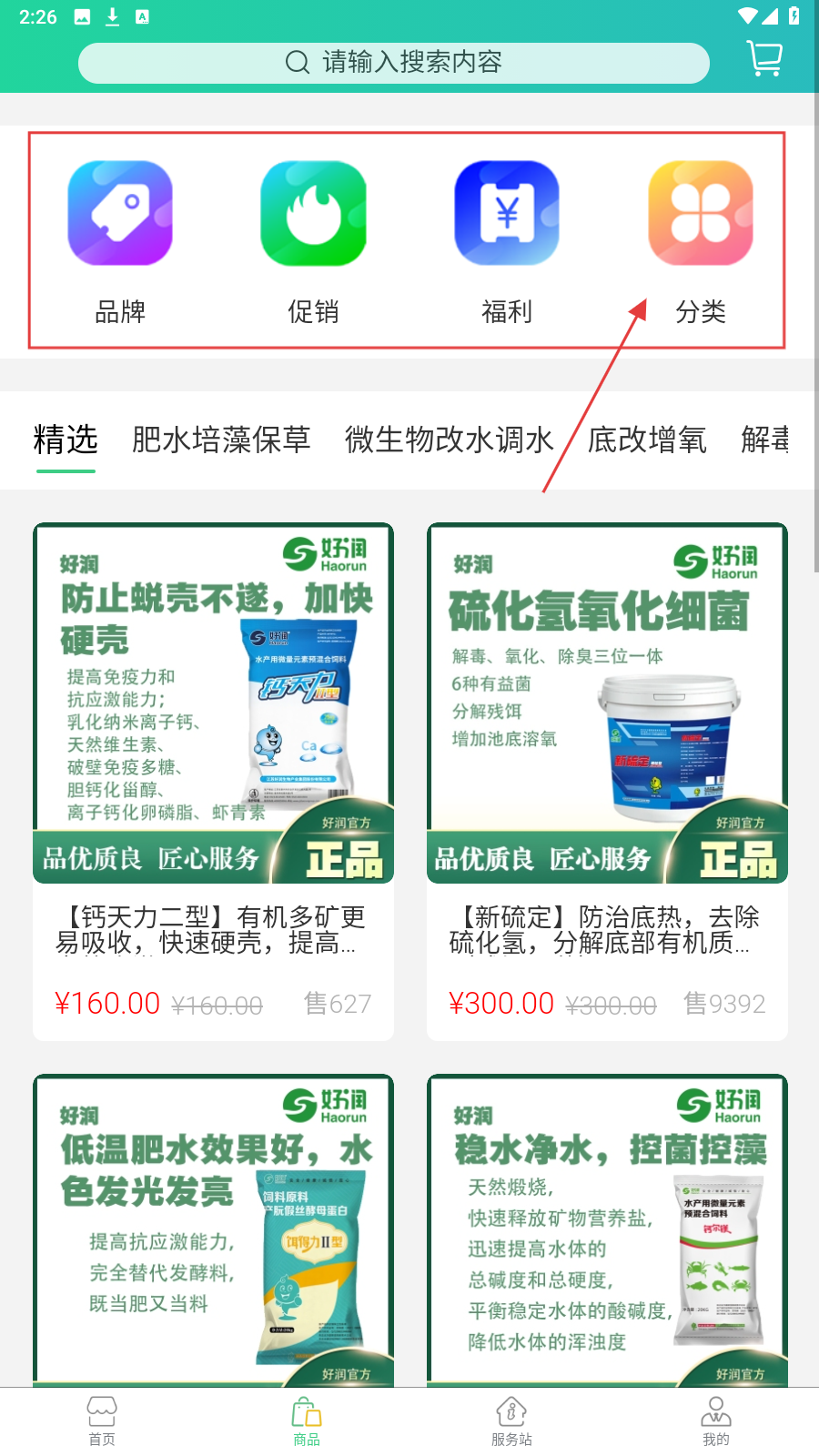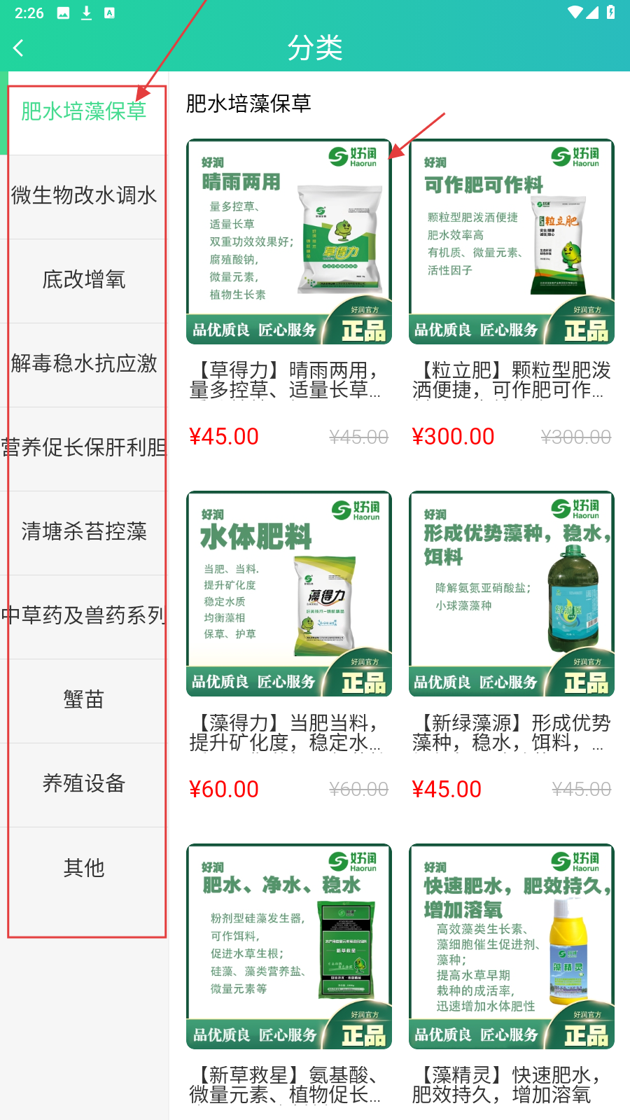 2、在分类页选对应类别,如【肥水培藻保草】,浏览该类商品列表。
