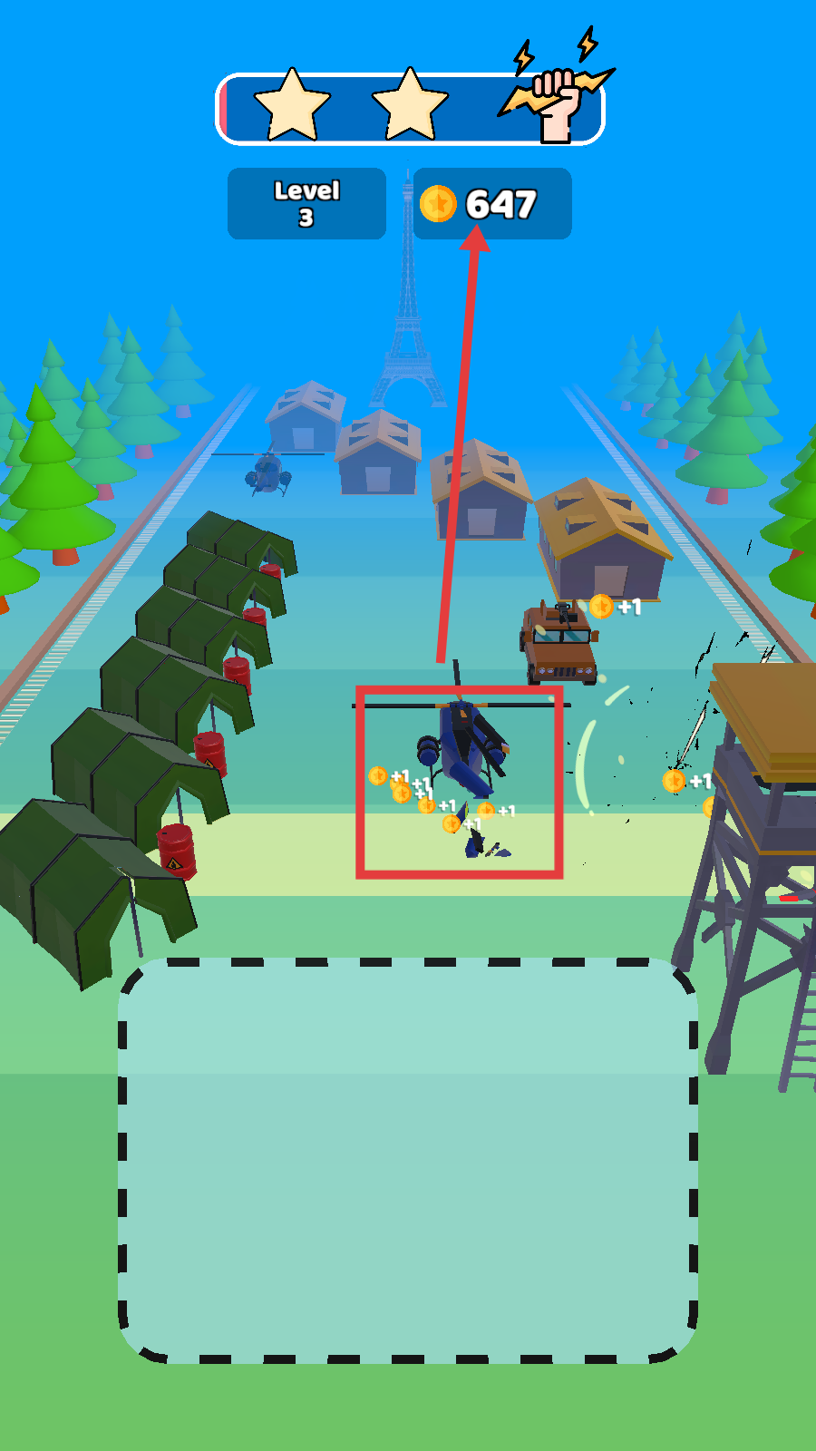 2、绘制特效摧毁【直升机】,收集掉落金币,使顶部金币从646增长至647+。