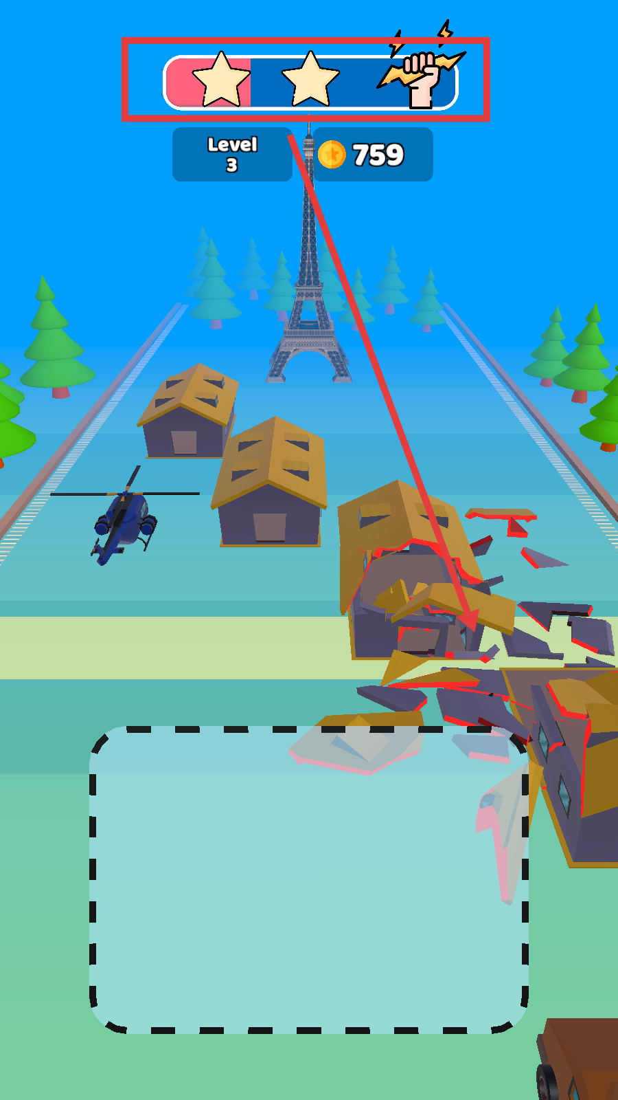 3、持续破坏房屋,推进顶部星级与能量条进度,解锁更复杂的破坏目标。