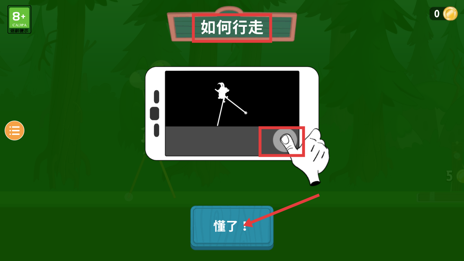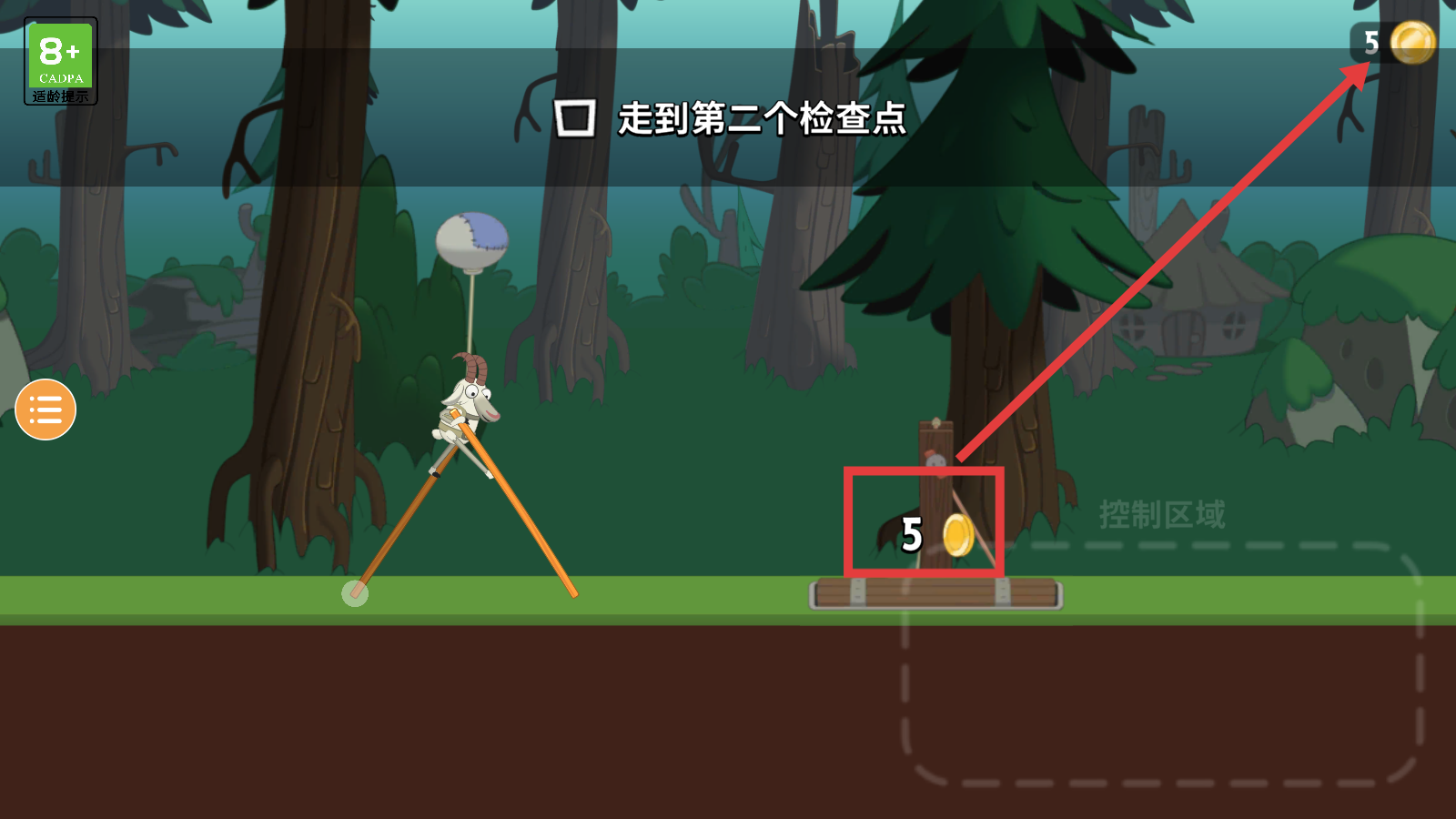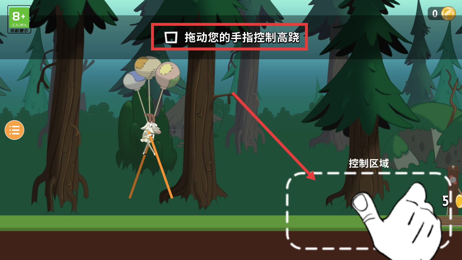 1、开局在【控制区域】拖动手指,熟悉【高跷】操控,开启森林闯关第一步。
