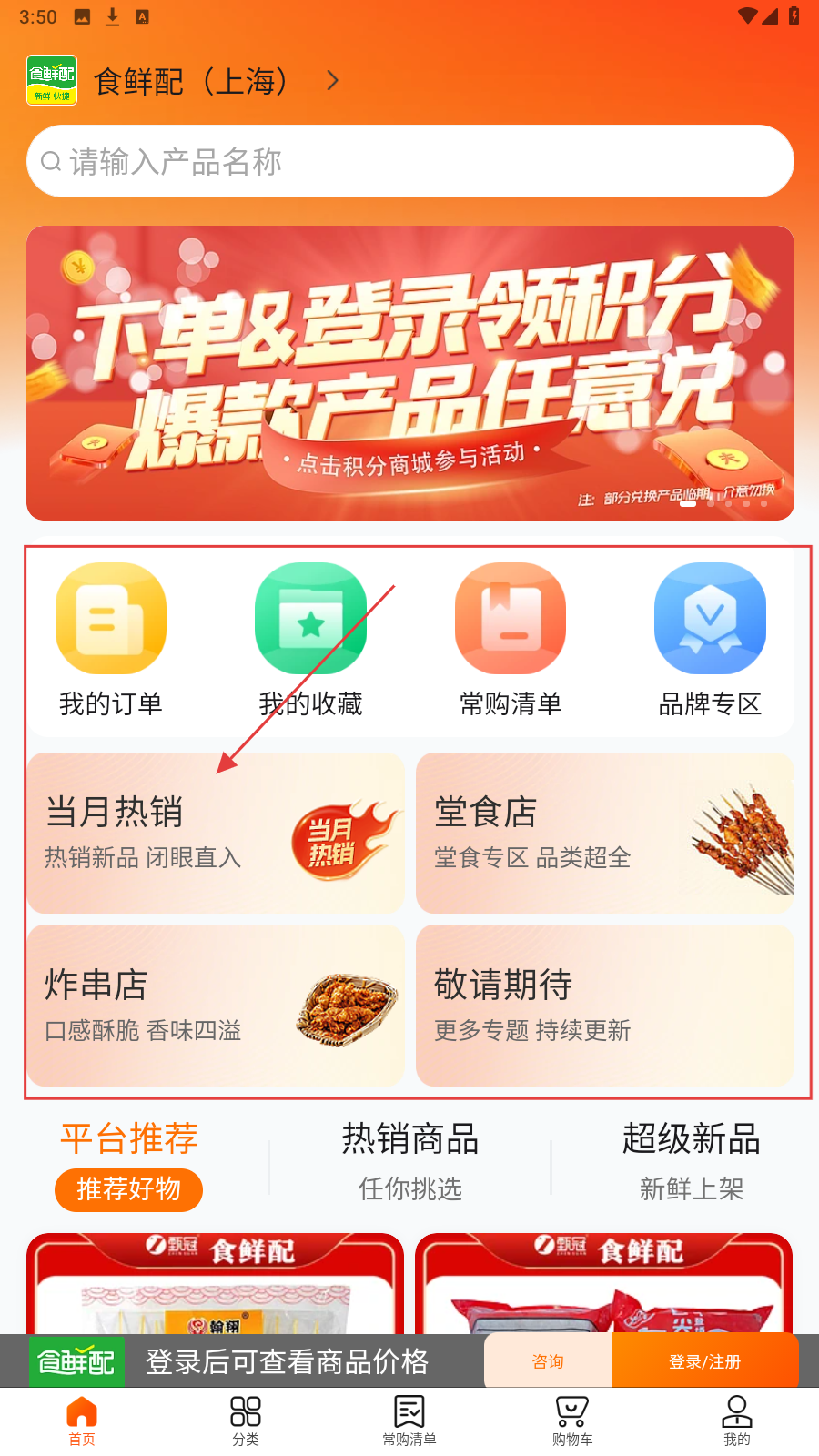 1、进入首页,点【当月热销】等专区,找热门商品品类。
