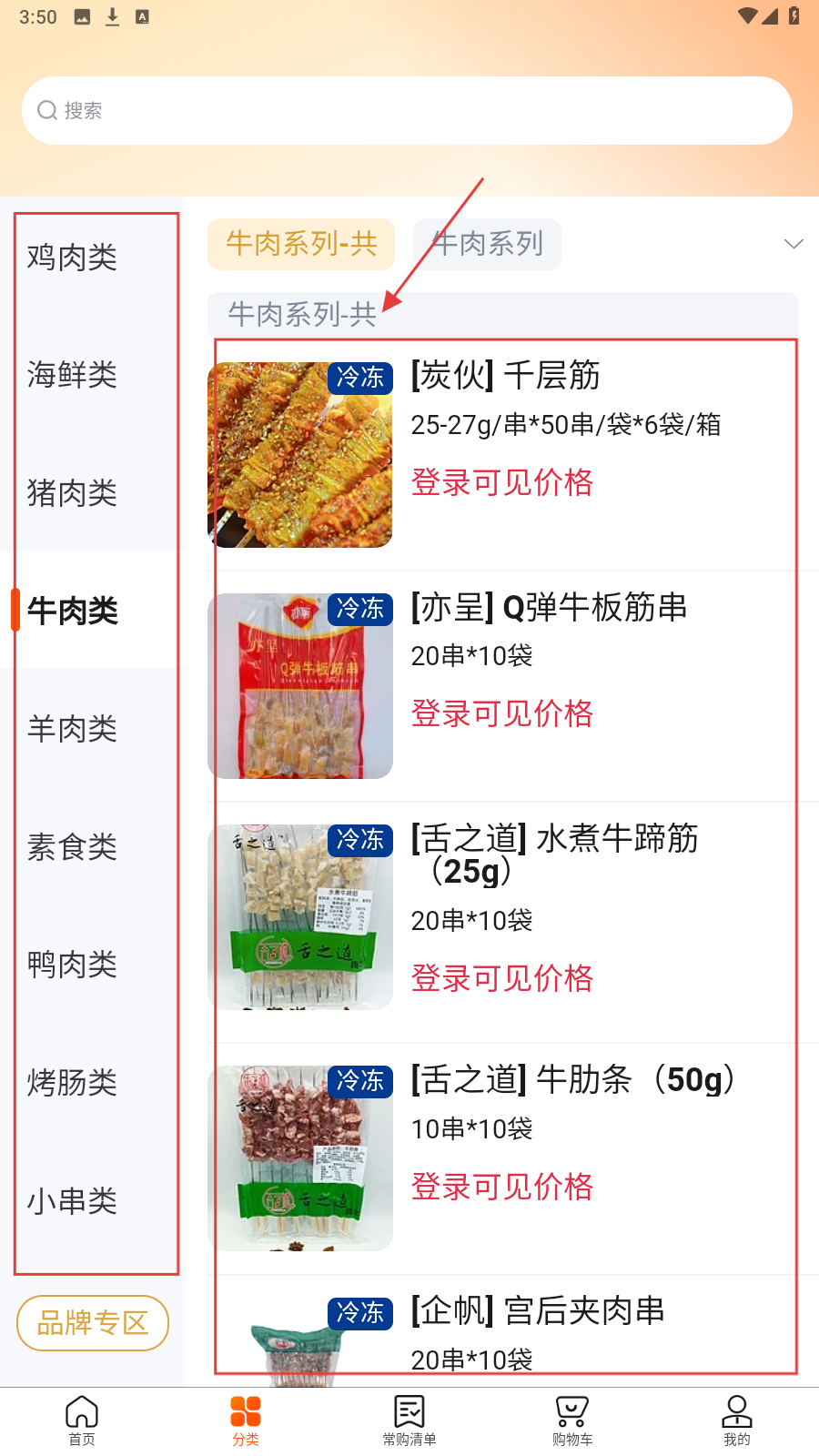 4、切换【分类】页,选牛肉类等,浏览对应商品,按需采购。