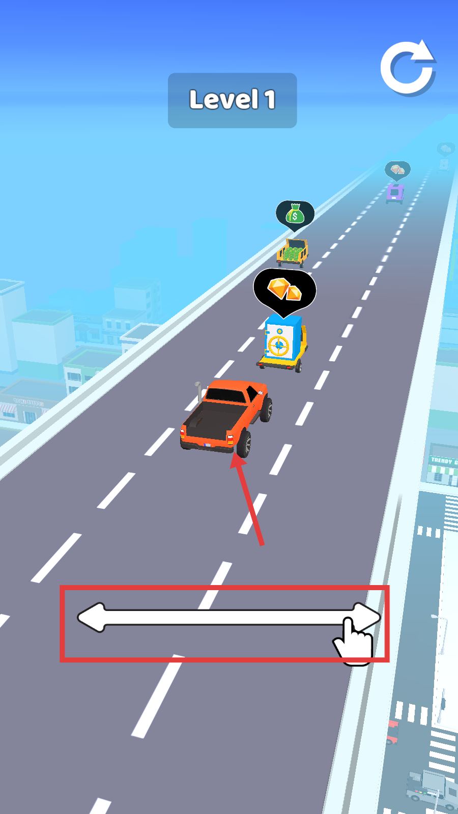 2、在【Level-1】中,通过左右滑动屏幕控制卡车移动,瞄准前方带道具的车辆靠近。
