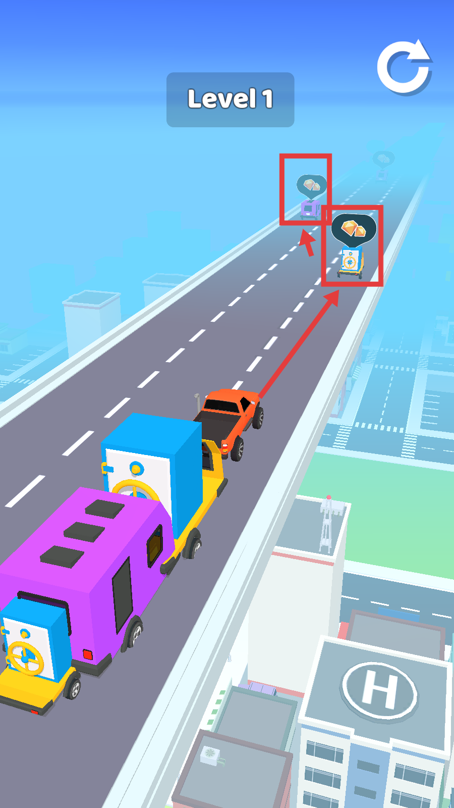 3、拖拽沿途车辆组成车队,持续追击道路前方标有道具图标的目标,扩大运输队伍。