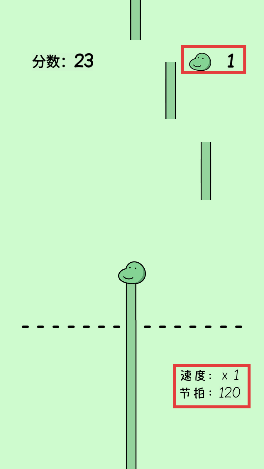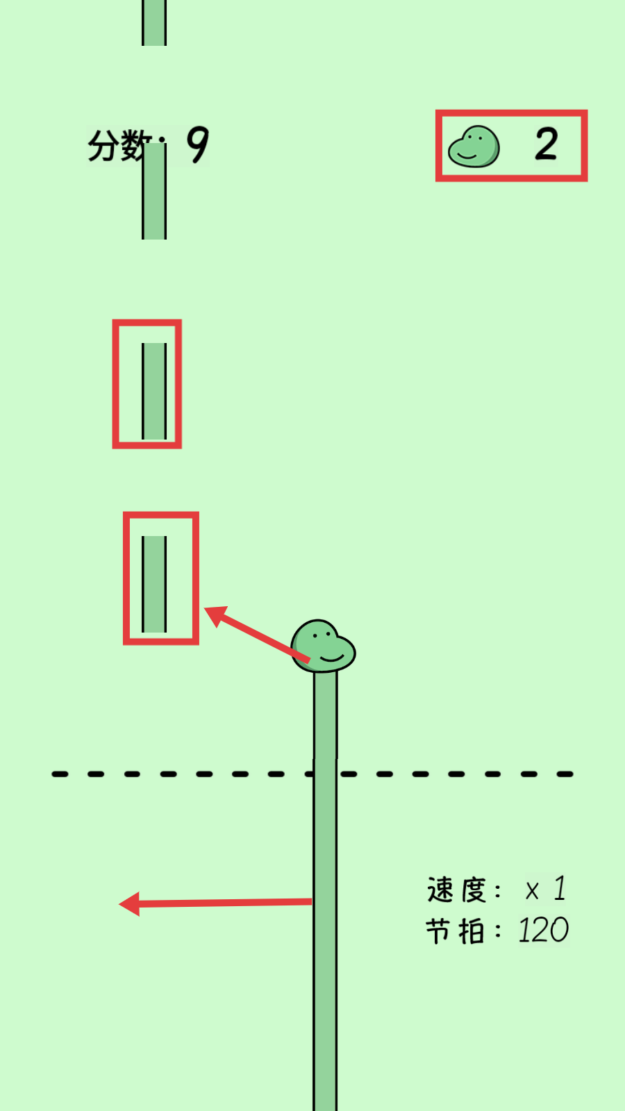 3、分数提升时,遵循【速度-×1】【节拍-120】的规律,精准躲避障碍,留存生命冲分。