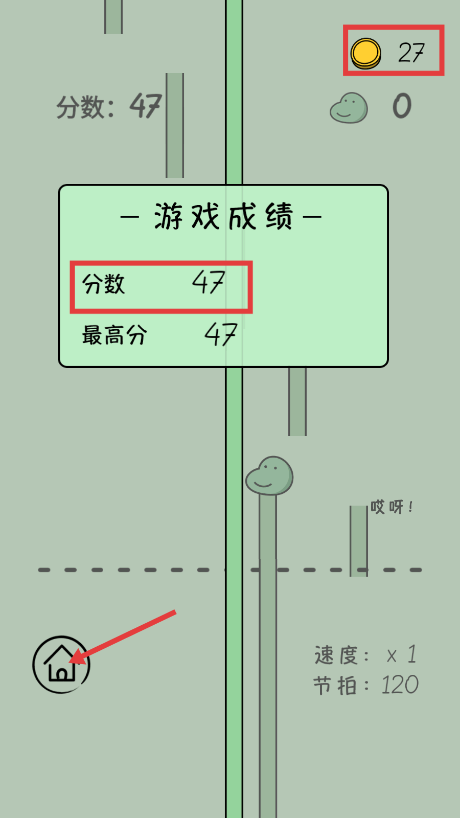4、结算界面查看【分数-47】与【27】金币,点击左下角房屋图标,返回游戏初始页。