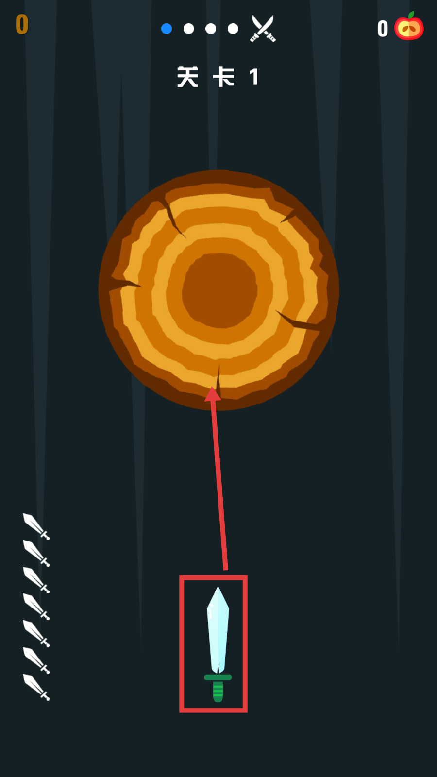 2、【关卡1】中瞄准树桩空白区域发射飞刀,避免触碰已存在的飞刀,确保每发都精准命中得分。