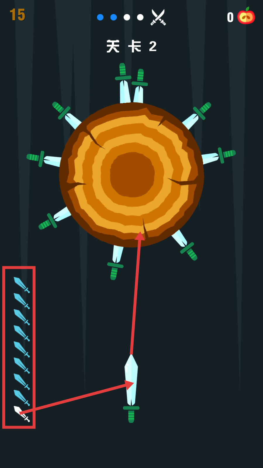 3、【关卡2】需观察树桩上已有飞刀的空隙,选取左侧蓝色飞刀,找准时机发射,维持连击提升成绩。