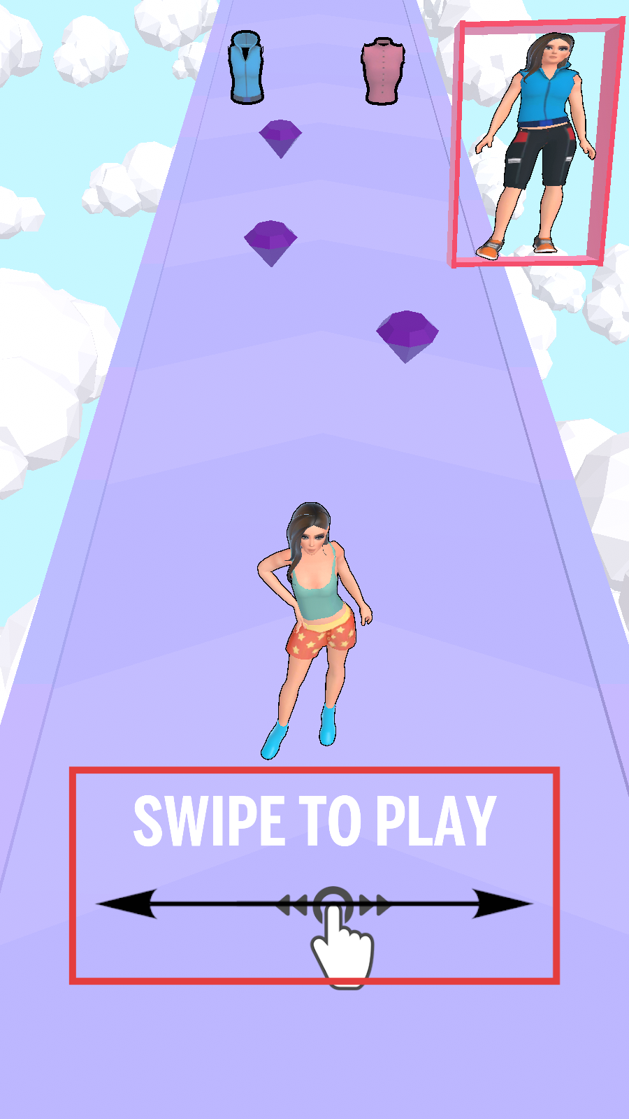 1、点击【SWIPE-TO-PLAY】开始游戏,操控角色奔跑,沿途收集紫色钻石与服装道具。