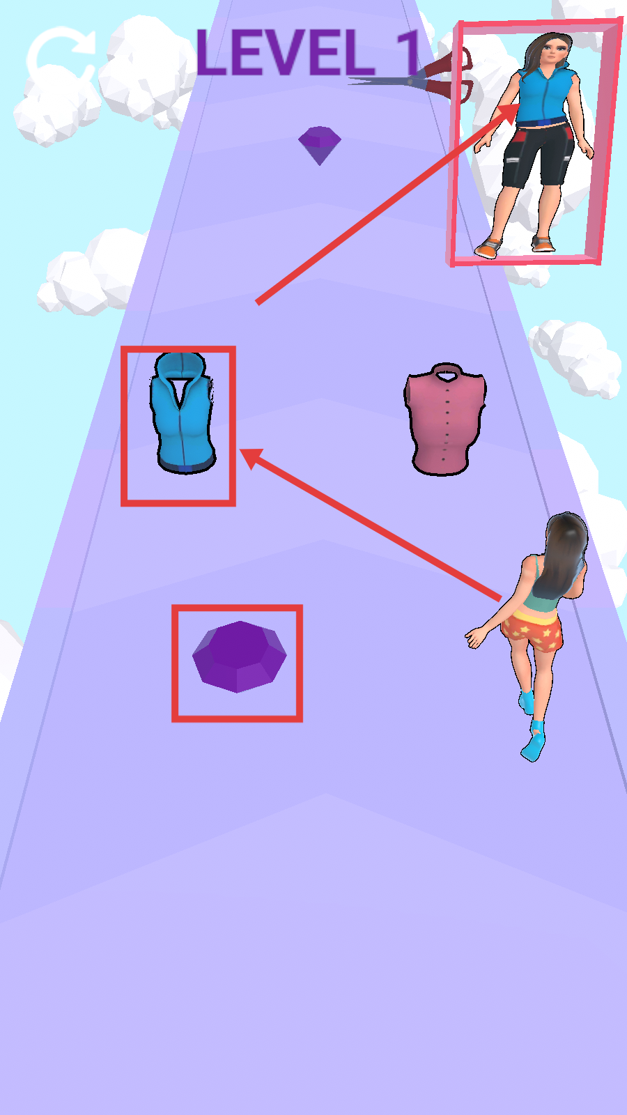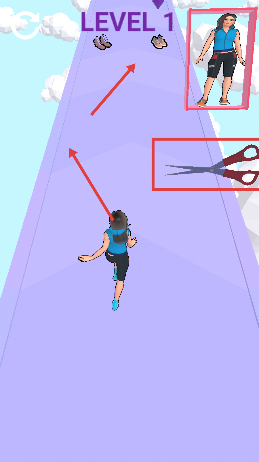 3、躲避右侧【红色剪刀】障碍,向上移动收集鞋子,完善角色穿搭以达成目标造型。