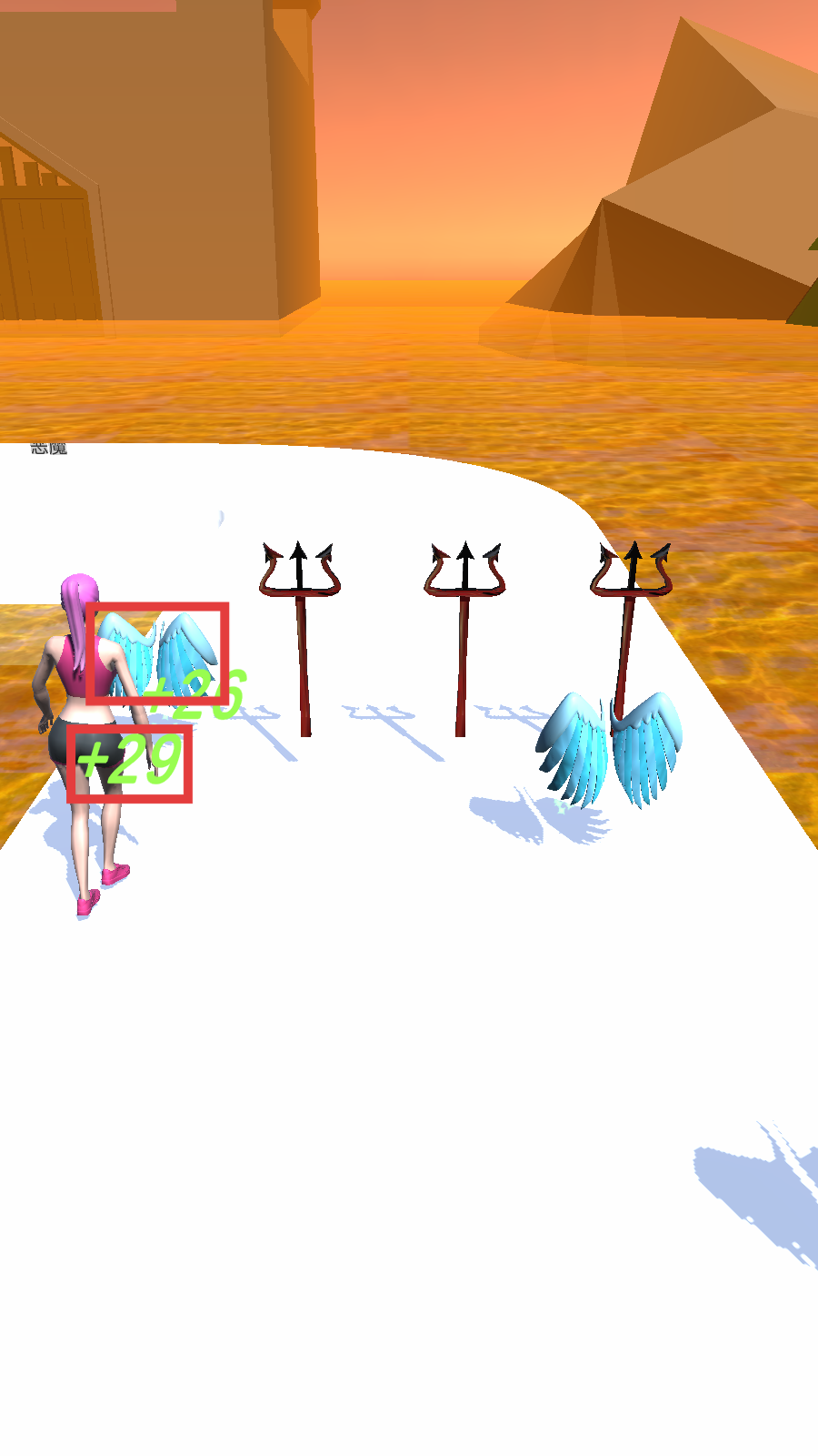 2、奔跑时优先拾取【蓝色翅膀-+29】,规避【恶魔三叉戟】障碍,积累天使阵营属性。