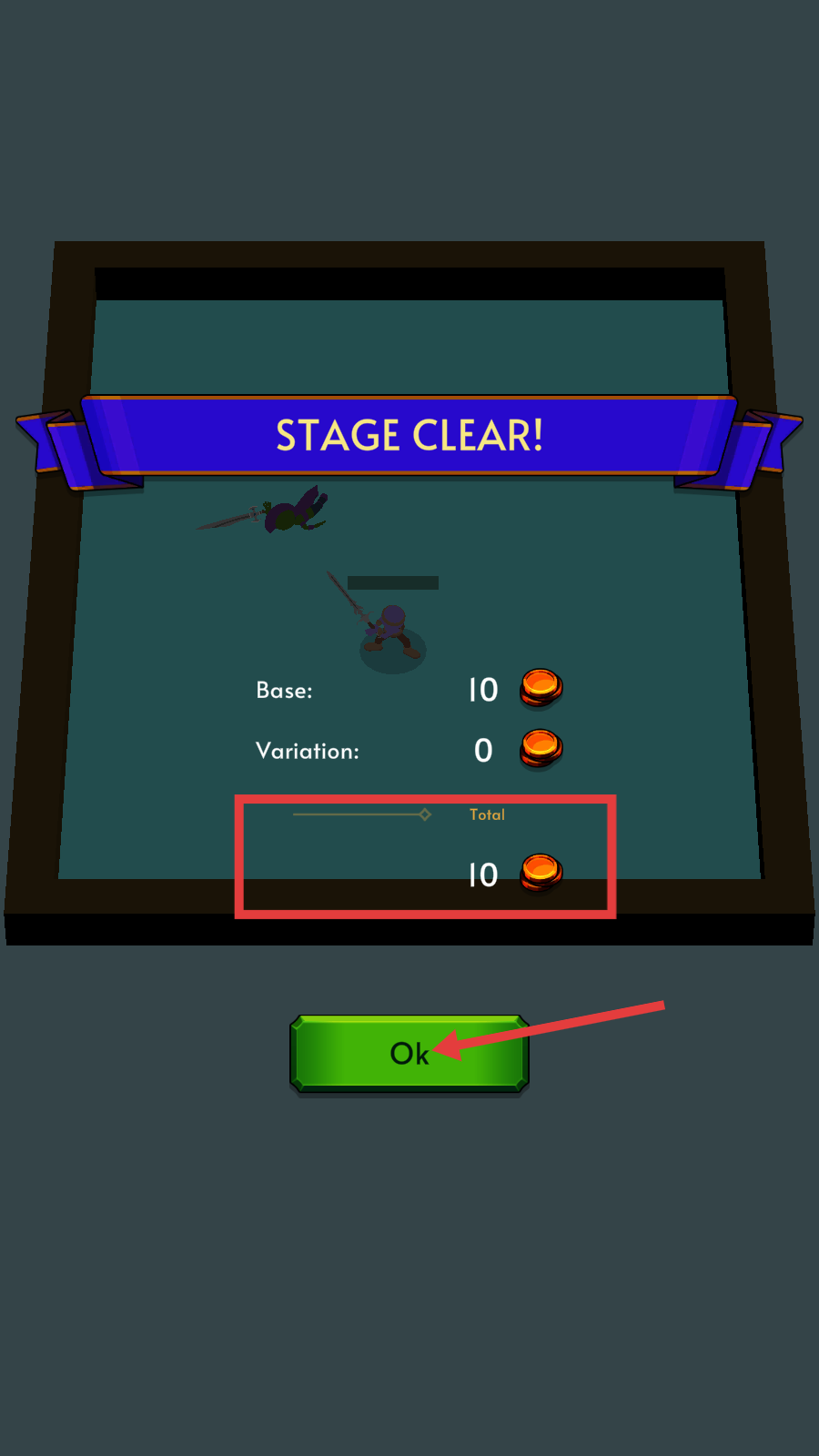 4、通关后点击【Ok】按钮,领取【Total-10】金币奖励,为后续成长储备资源。