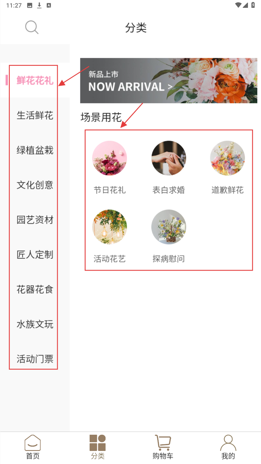 1、进入分类页,选【鲜花花礼】,在场景用花里挑【节日花礼】等需求分类。