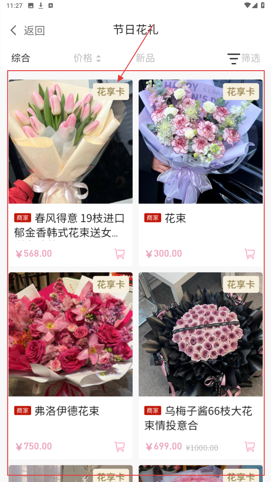 2、进入【节日花礼】列表,浏览不同花束,选心仪款式查看详情。