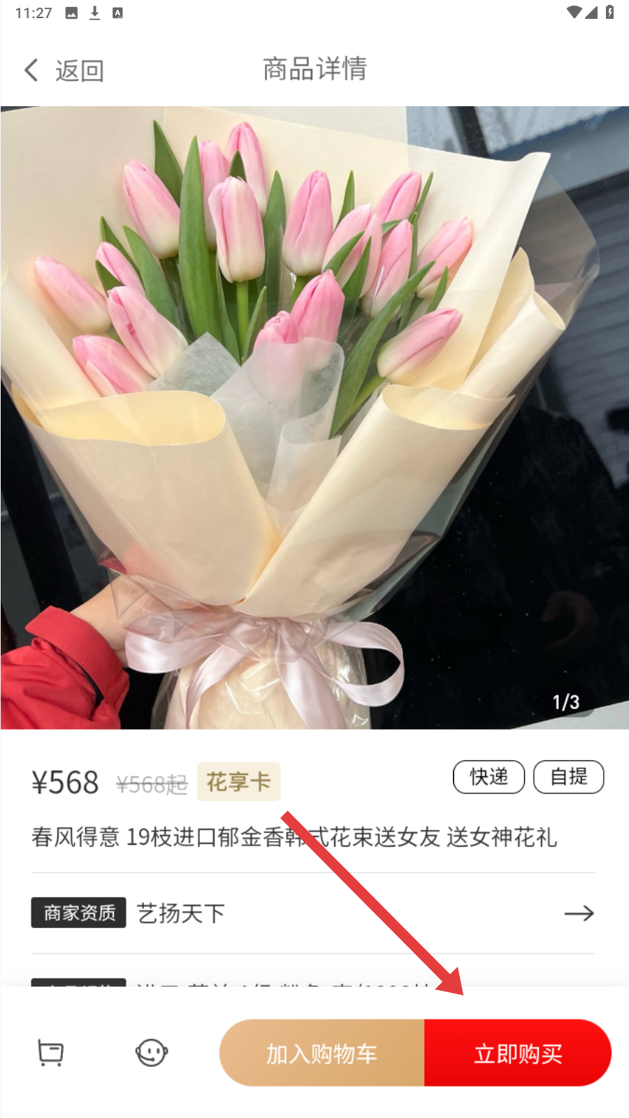 3、在商品详情页,确认花束信息后,点【立即购买】进入下单流程。