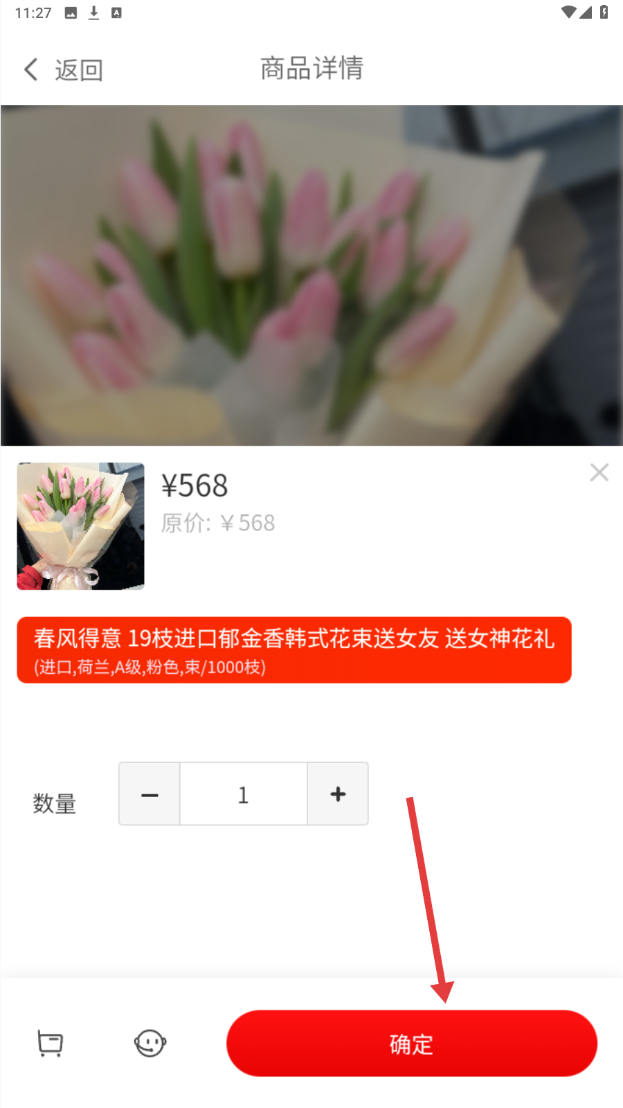 4、选好数量,核对商品信息,点【确定】完成花束购买操作。