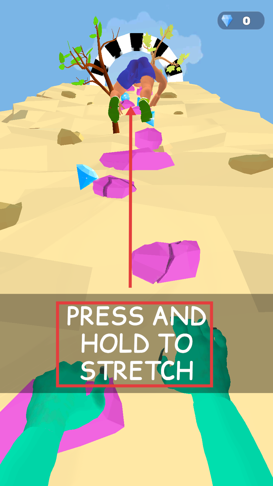 2、按照【PRESS-AND-HOLD-TO-STRETCH】提示,长按屏幕让角色拉伸移动,跨越紫色石块。