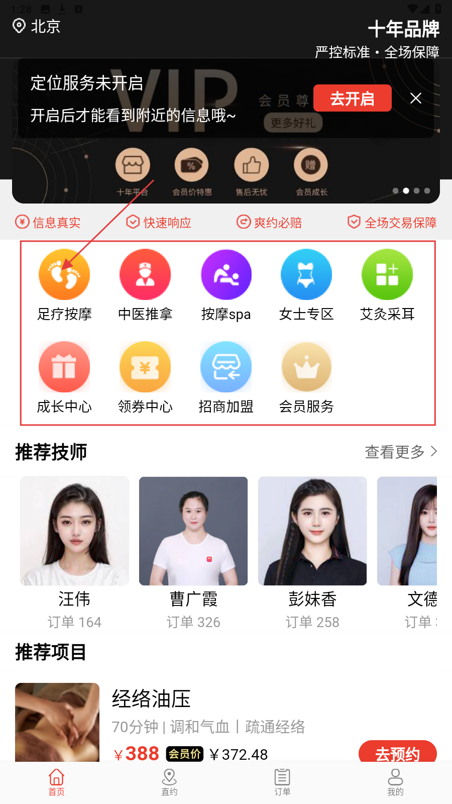 1、打开首页,选【足疗按摩】等服务分类,快速找想体验的项目类别。