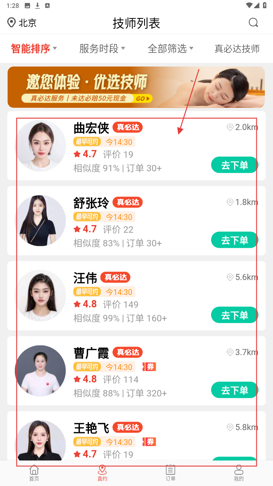 4、还可以切换至【技师列表】,依据评分、距离选技师,点【去下单】进行预约。