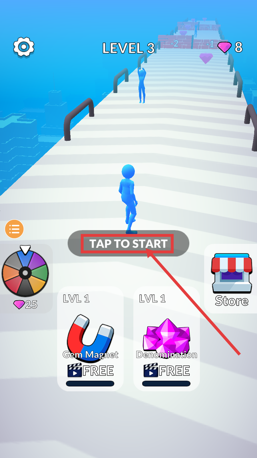 1、点击【TAP-TO-START】启动【LEVEL-3】,进入条纹跑道,准备开启钻石收集冒险。