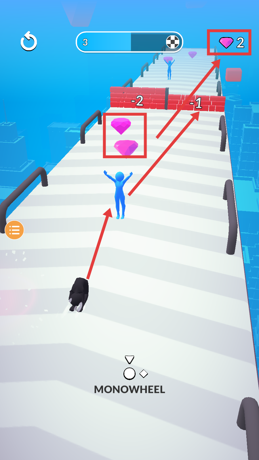 3、操控角色收集粉色钻石,积累钻石至【2】,收集路上的蓝色小人用于突破【-1】的石壁障碍。