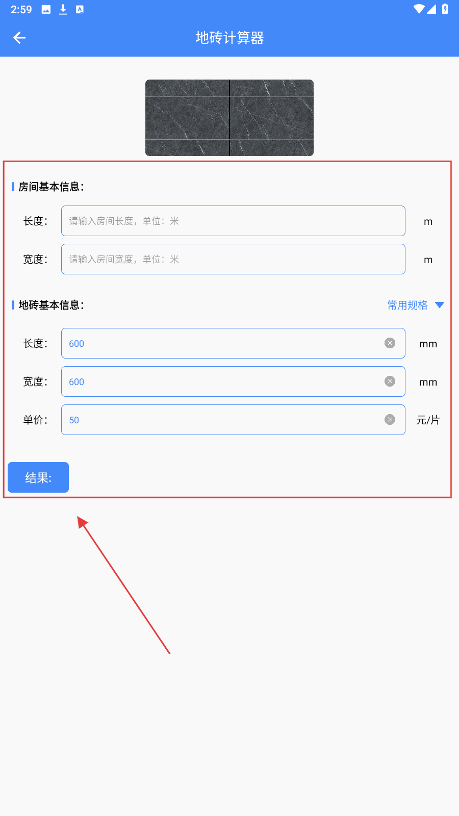 2、在【地砖计算器】页,准确录入长度、宽度、单价,点【结果】出数据。