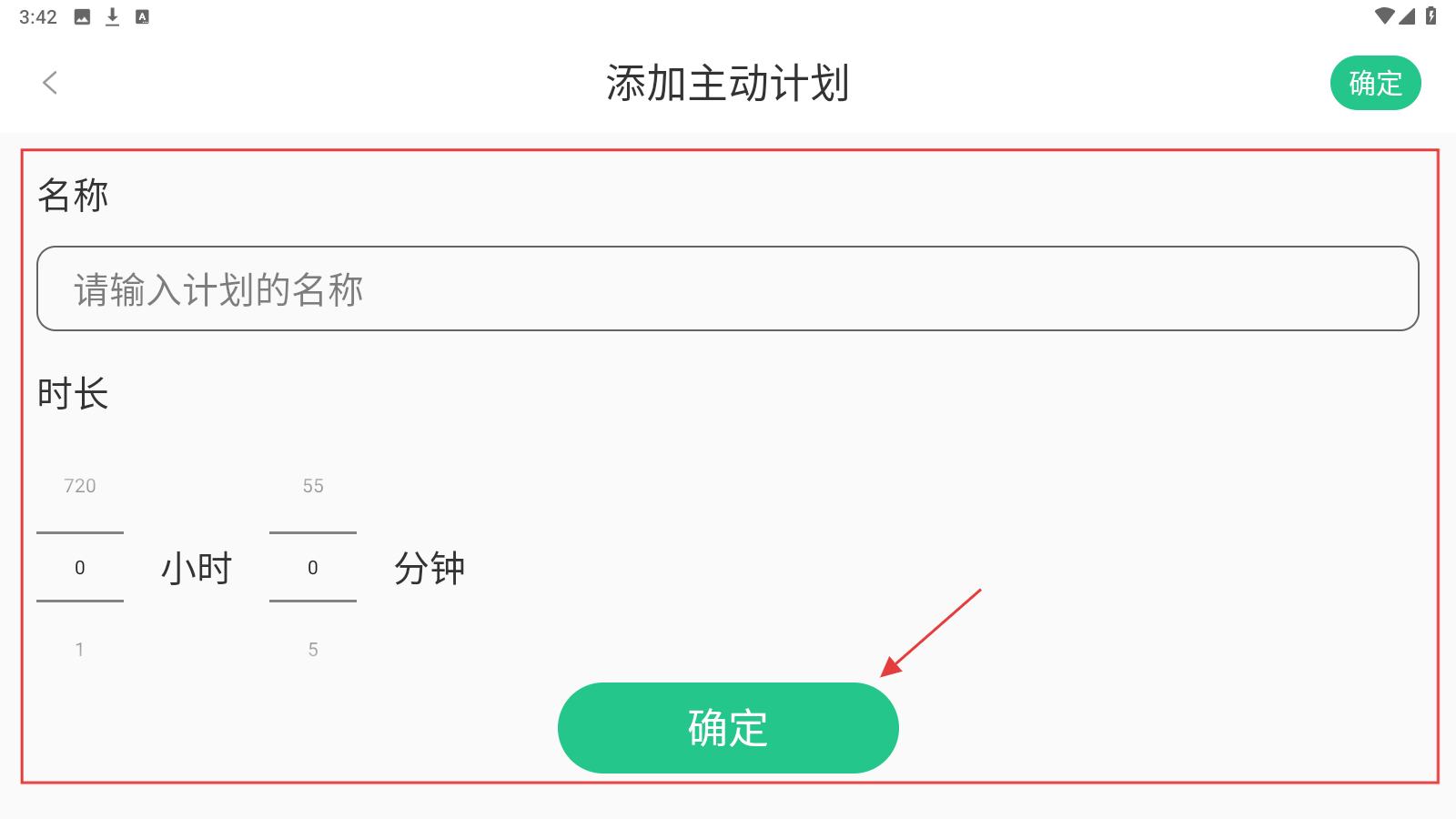 3、填主动计划【名称】【时长】,点【确定】完成添加。