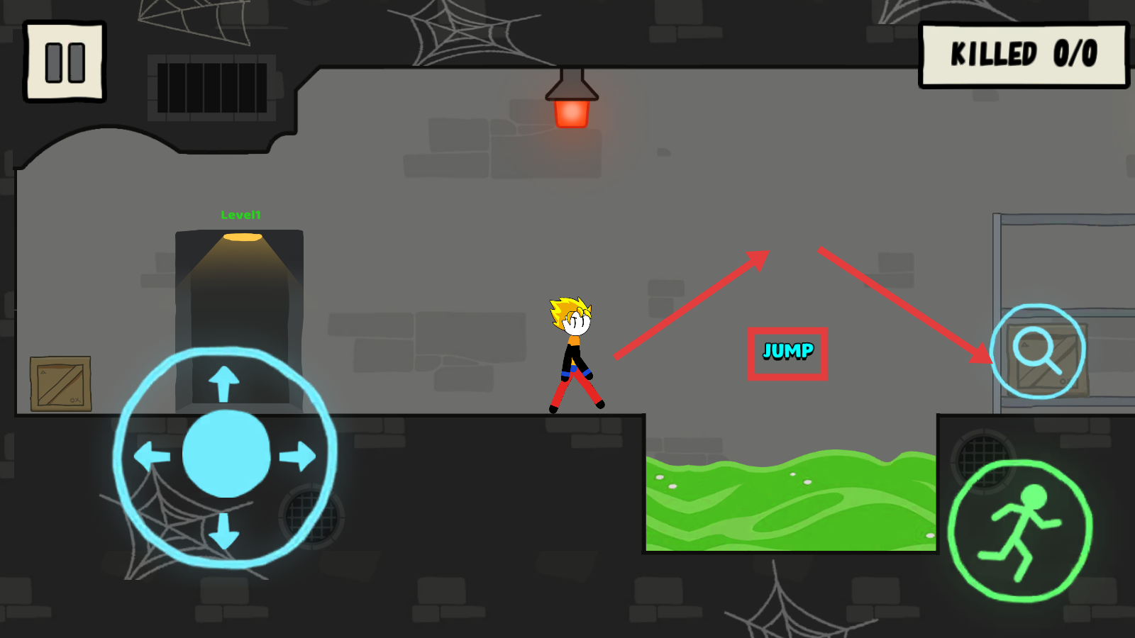 3、根据场景中【JUMP】的提示,快速飞跃过绿色液体的水池,奔向终点推进关卡进程。