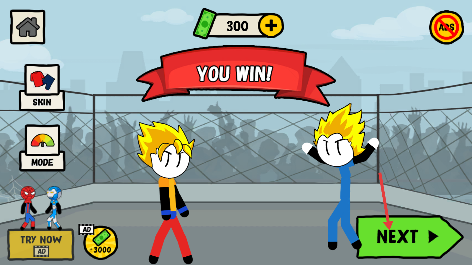 4、通关后点击【绿色NEXT】,积累金钱(如300),解锁【SKIN皮肤】或【MODE模式】拓展玩法。