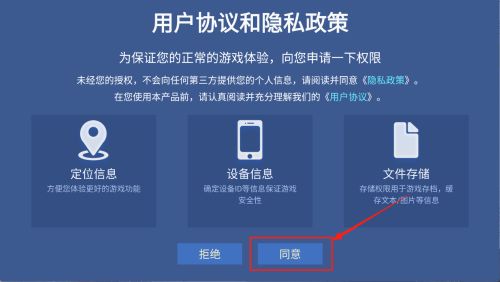 2、同意隐私政策:在权限申请弹窗点击“同意”,授权定位、设备和存储权限继续。
