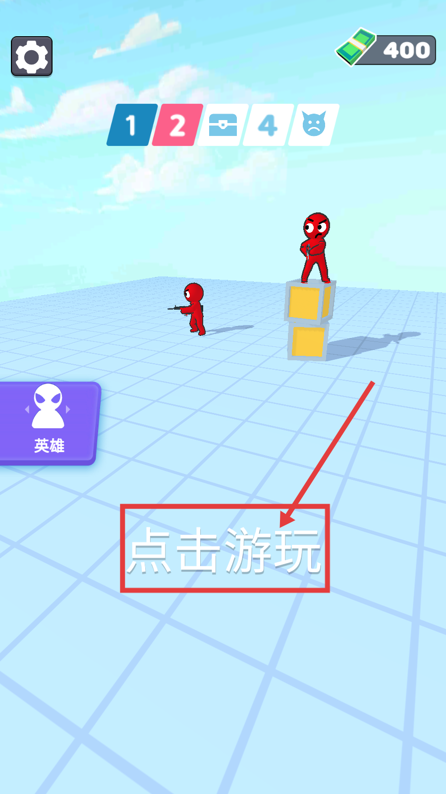 1、进入游戏界面,点击【点击游玩】,留意【英雄】按钮与上方货币-关卡标识,开启挑战准备。