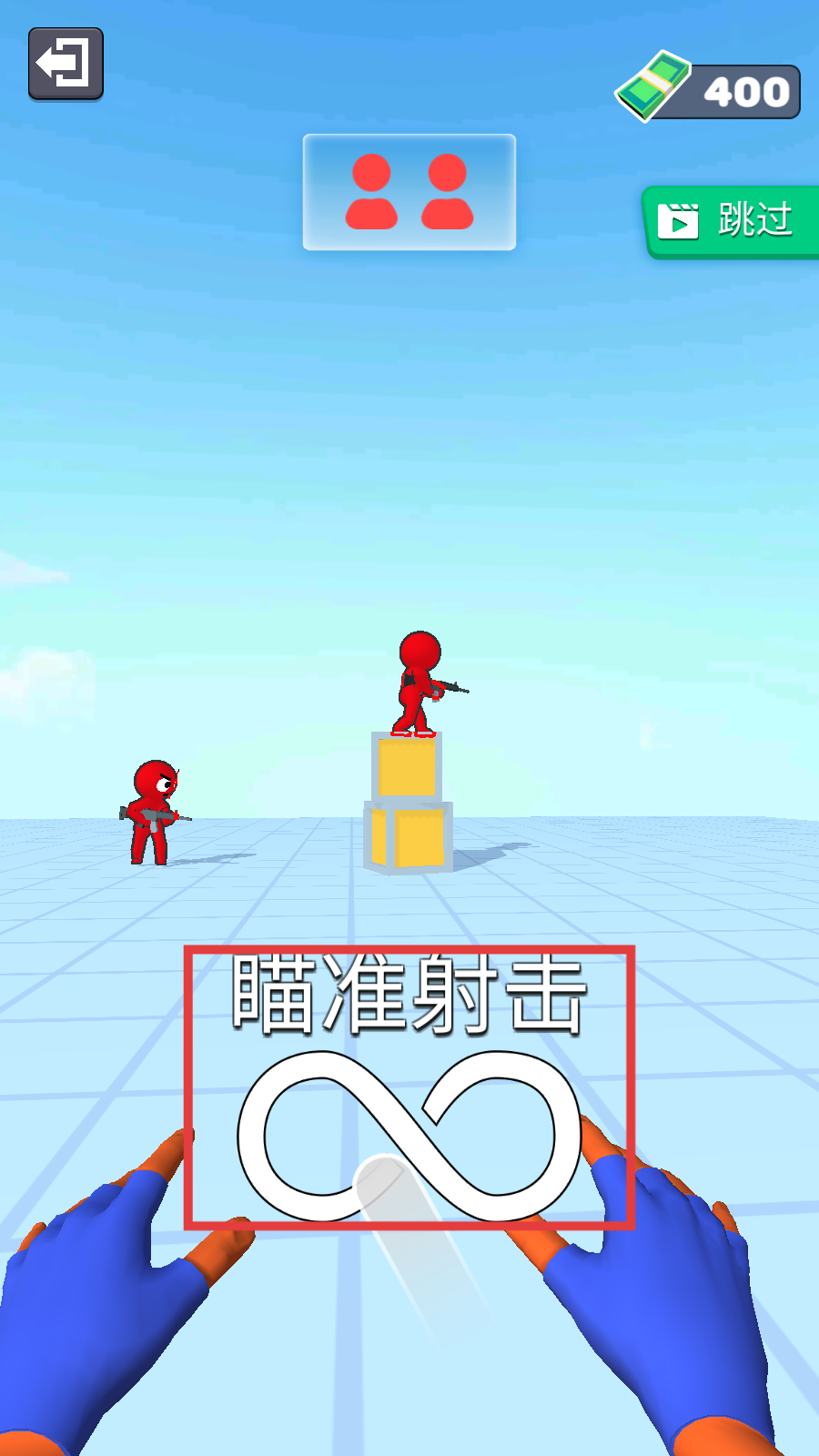 3、面对多个红色敌人,观察站位,用射击轨迹命中所有目标,完成上方【双人】消灭要求推进关卡。