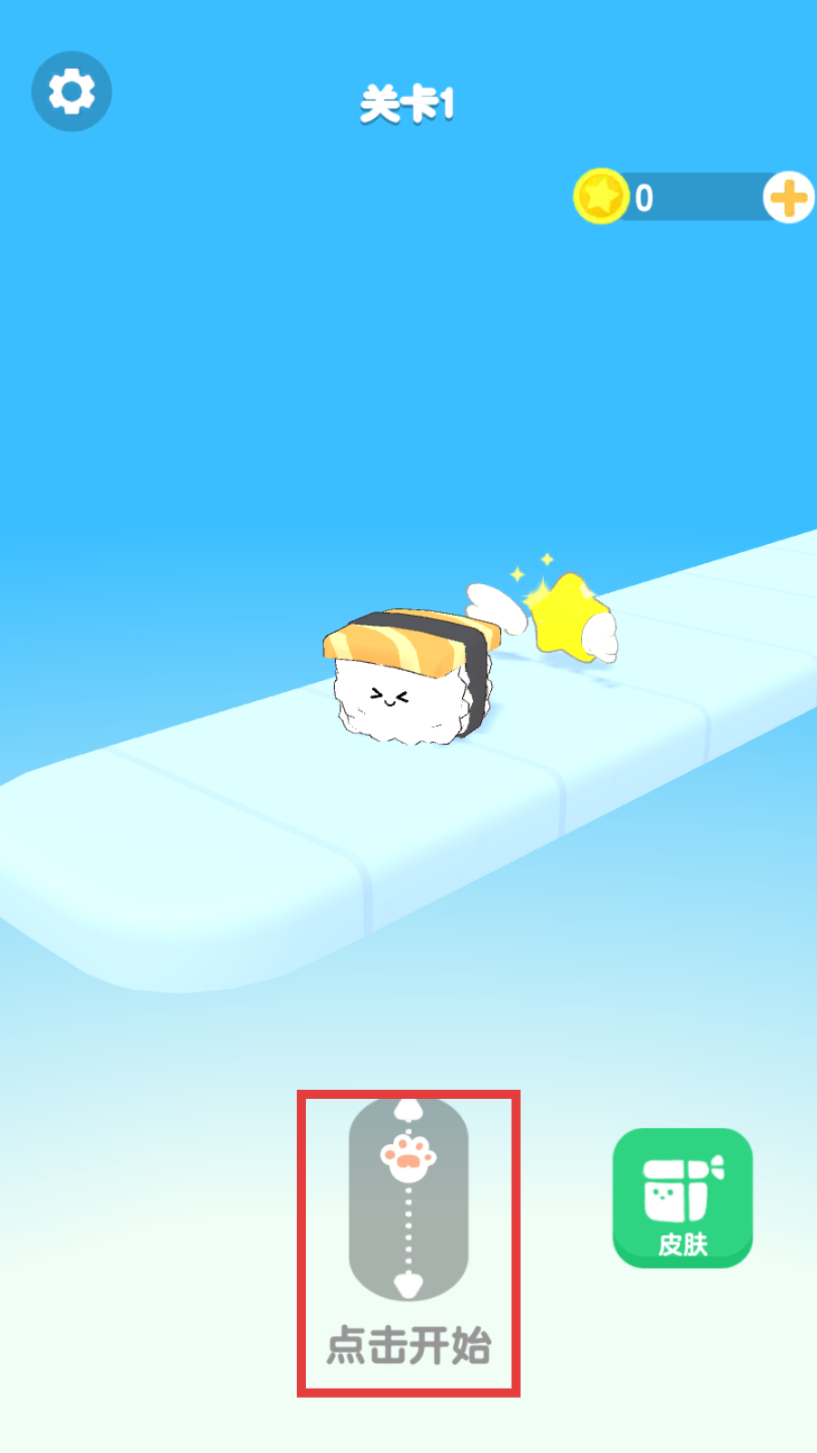 1、进入【关卡1】,点击底部【点击开始】,操控寿司角色开启跑酷挑战,初始金币为0。