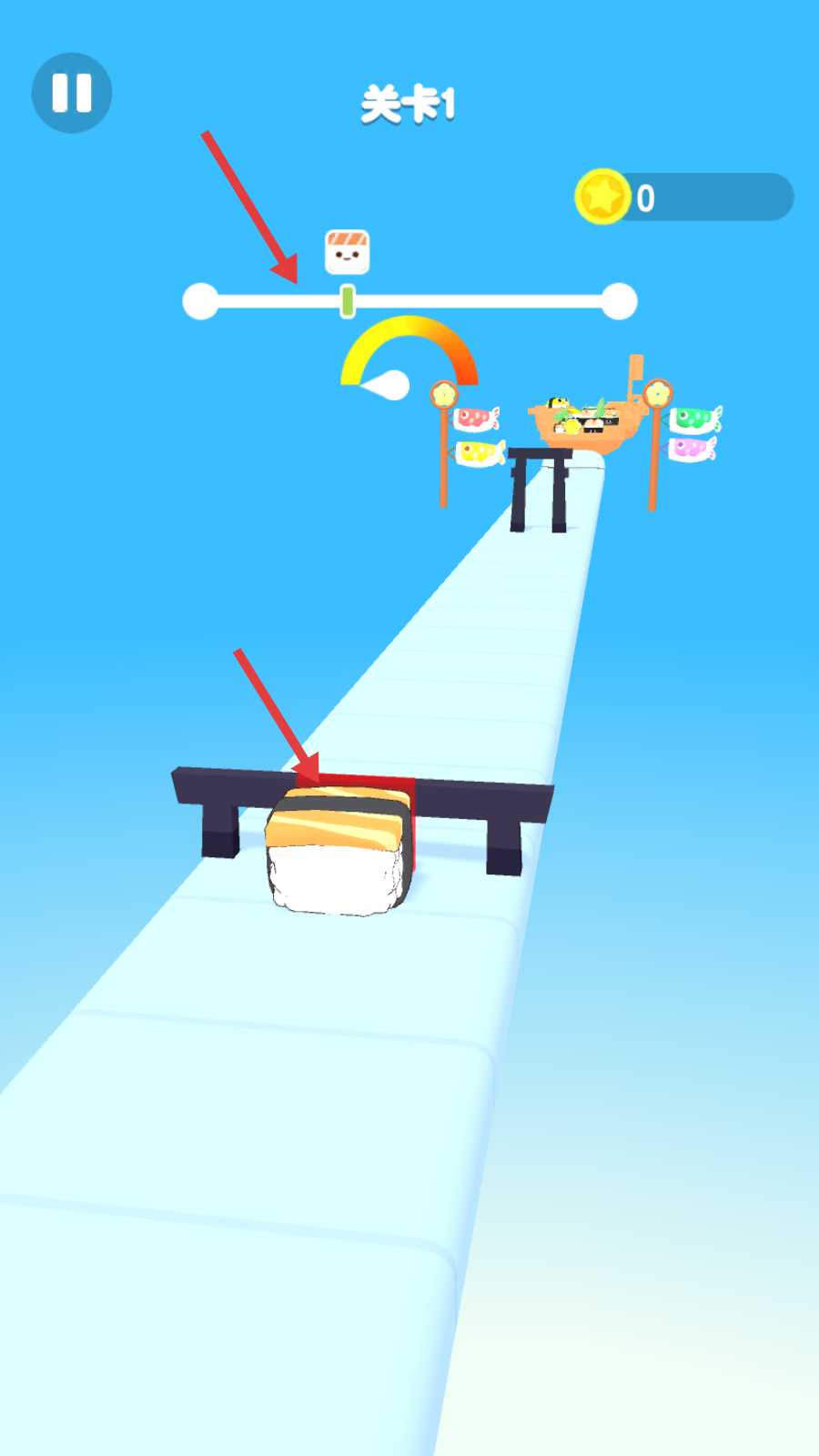 2、跑道遇黑色栏杆障碍,观察上方进度条,操控寿司跨越障碍,向终点推进。